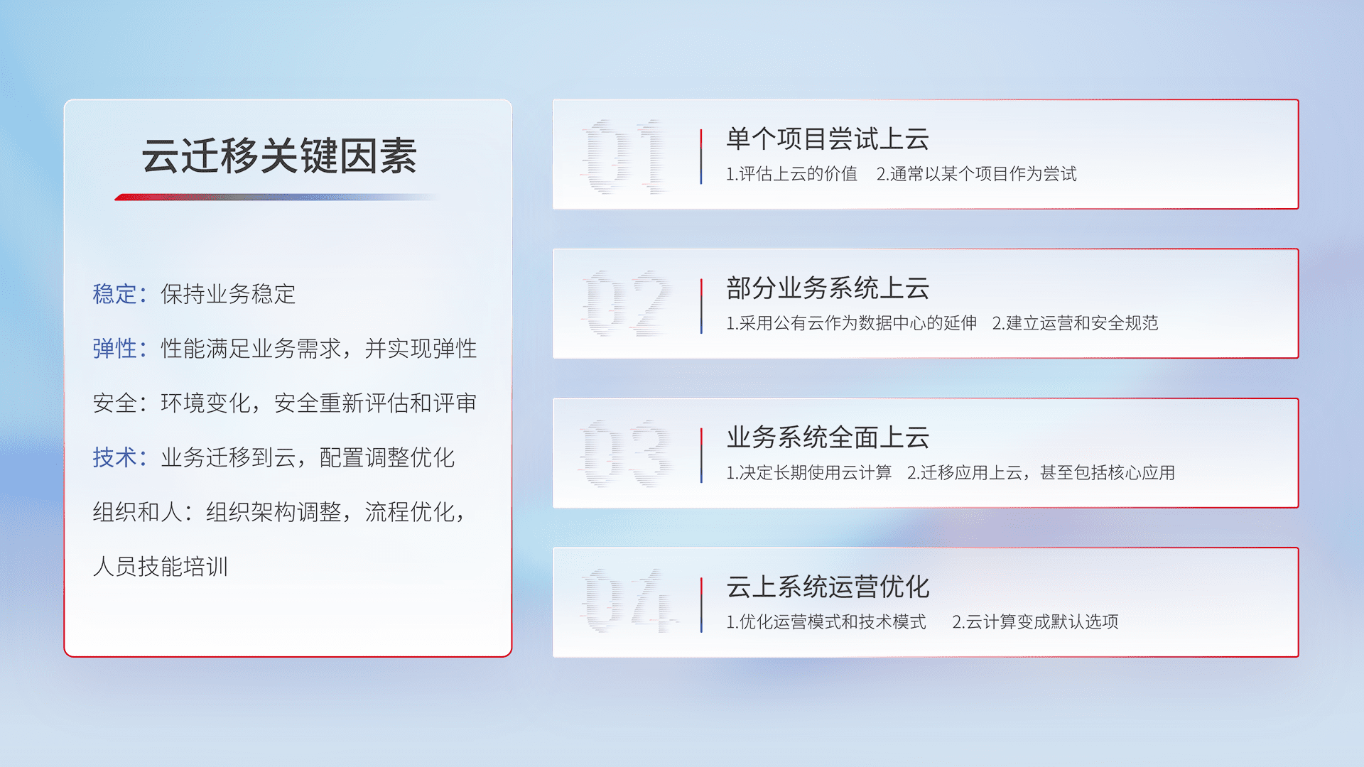 结合实际业务,,,从规划设计、、、云平台选型、、、云原生改造、、、、数据迁移、、、集成交付,,,迁移全过程为客户识别最佳上云路径,,,,做好风险识别管理,,,设计网络架构、、、身份权限、、安全审计合规、、、、操作审计、、、、日志审计、、监控告警策略、、、、多站点容灾设计等,,,对云上基础设施进行整体规划,,,,提升IT治理水平,,,,以满足弹性、、、高可用、、高性能的需求。。