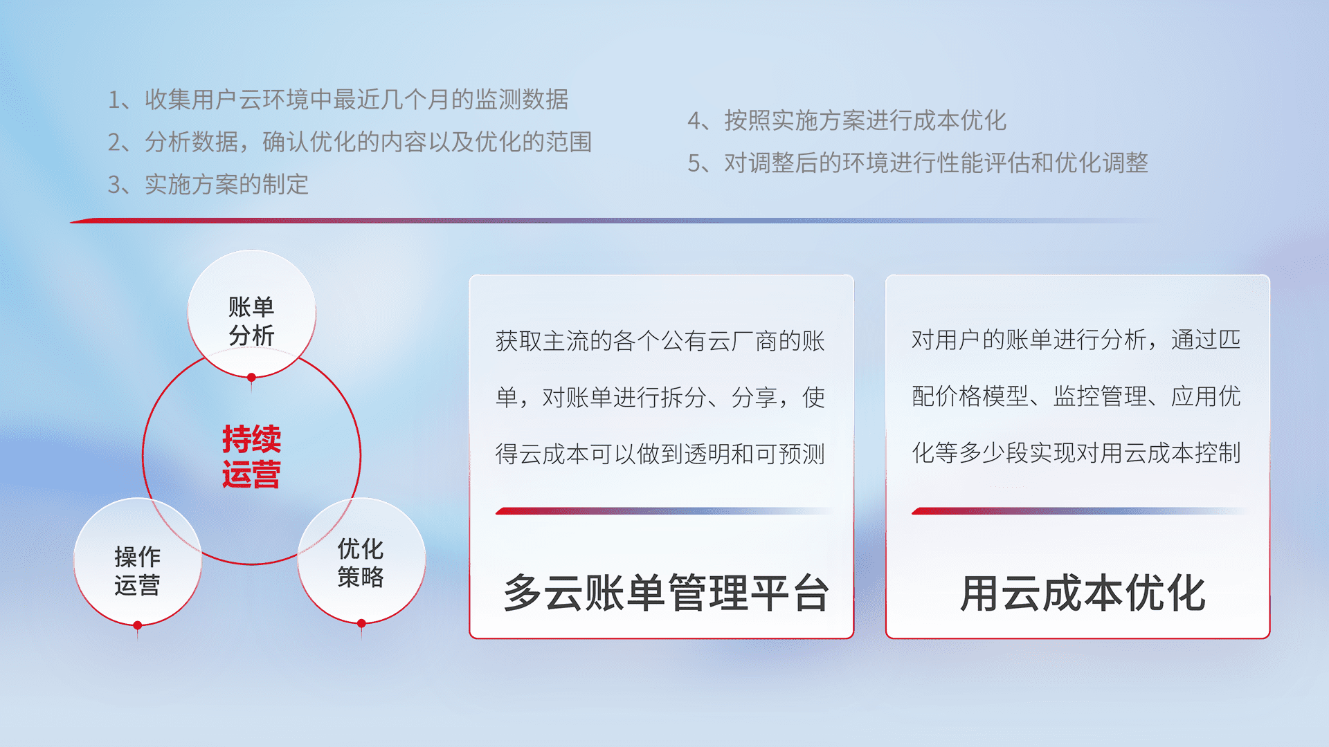 通过多云纳管,,,以统一的资源数据模型把客户的云资源进行抽象和封装,,进而实现对多云资源的统一操作,,保障云资源管理的可靠性、、、稳定性与可用性。。量身定制化运维内容,,,,配置、、、开发运维、、、补丁管理、、备份、、、监控、、、、认证和访问管理、、审计和日常巡检等,,保障在用云过程中的可靠度,,,稳定度以及高可用率。。。。